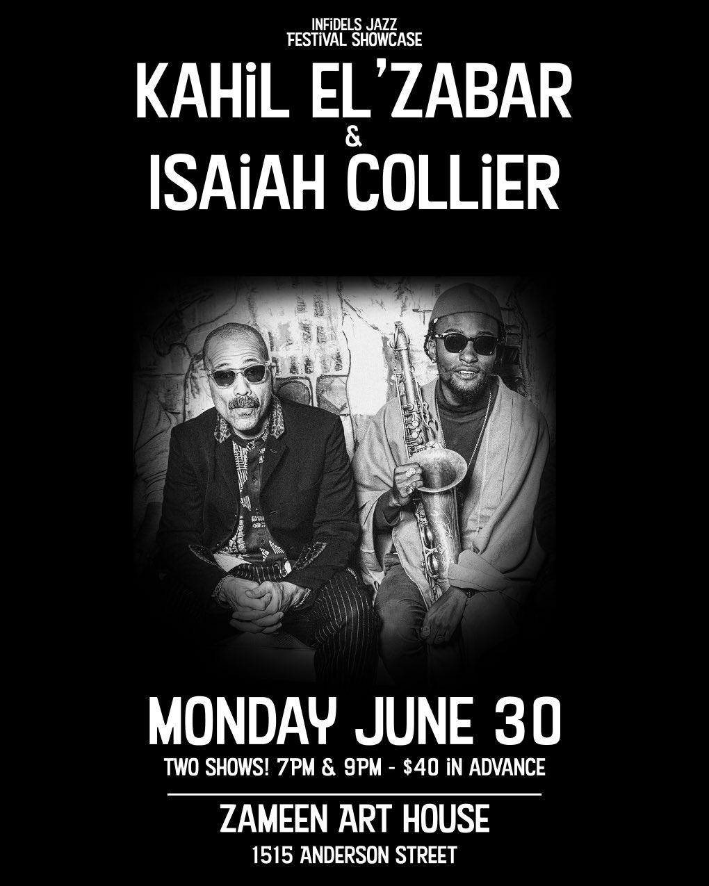 THESE PERFORMANCES REPLACE THE KAHIL EL’ZABAR & DAVID MURRAY CONCERTS PREVIOUSLY ANNOUNCED. TICKETS TO THOSE CONCERTS CAN BE USED FOR THE CORRESPONDING El’ZABAR & COLLIER CONCERT (7 & 9PM RESPECTIVELY). IF A REFUND FOR THAT CONCERT IS REQUIRED, PLEASE CONTACT THEINFIDELSJAZZ@GMAIL.COM AND A REFUND WILL BE GRANTED.