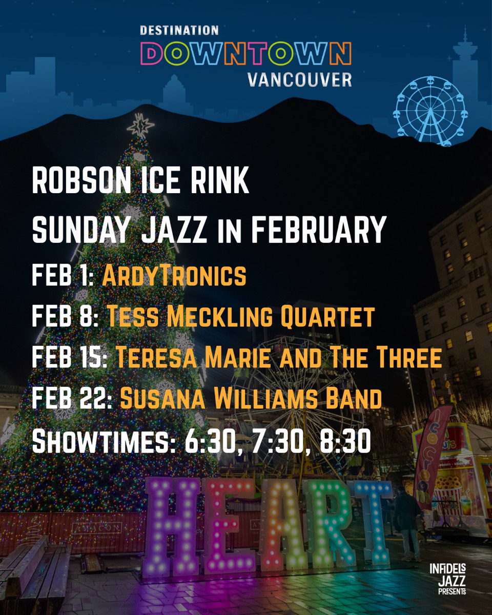 Infidels Jazz Presents: Robson Ice Rink in February performances Susana Williams Band Showtimes: 6:30pm, 7:30pm, 8:30pm Destination Downtown Vancouver (https://destinationdowntown.co/) Outdoor skating at Robson Square Ice Rink - there’s nothing […]